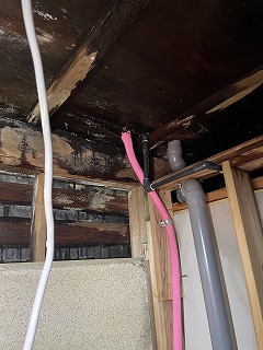 浴室点検口から2階キッチン下の天井を見ると、びちゃびちゃ
