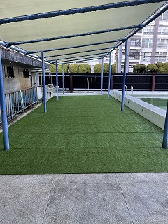 大阪府立高校、プールサイド土間を人工芝へ改修工事さていただきました。